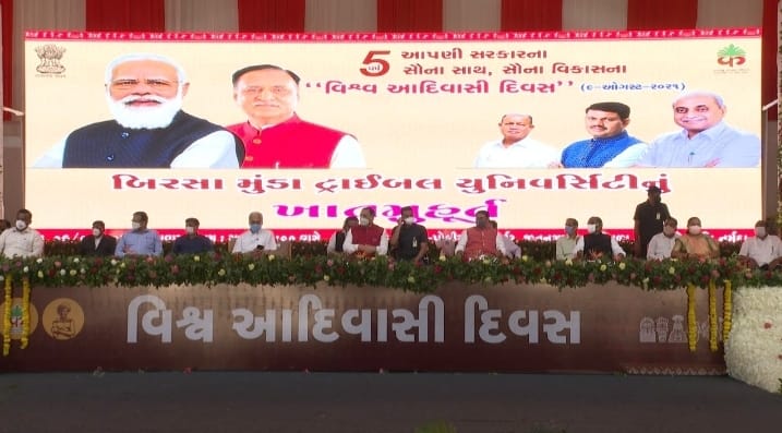 મુખ્યમંત્રી વિજયભાઈ રૂપાણી સરકારના સુશાસનના સફળ પાંચ વર્ષ પૂર્ણ થવા અવસરે આદરવામાં આવેલા જનસેવા યજ્ઞ અનુષ્ઠાનનો નવમો દિવસ અંબાજીથી ઉંમરગામ સુધીના પૂર્વ પટ્ટીના આદિવાસીઓના સર્વાંગી વિકાસને સમર્પિત કરવામાં આવ્યો હતો જેની પુર્ણાહુતી રાજપીપલા ખાતે વિશ્વ આદિવાસી દિવસ તરીકે ઉજવી ઉજવણી કરી હતી જેમાં મુખ્યંત્રીએ આજે નર્મદા જિલ્લાના રાજપીપલાથી વિશ્વ આદિવાસી દિવસના અવસરે રાજપીપળા નજીક જીતનગર ખાતે અંદાજે રૂ.૩૪૧ કરોડના ખર્ચે નિર્માણ થનાર બિરસા મુંડા ટ્રાઇબલ યુનિવર્સિટીનું ખાતમુહૂર્તકર્યું કર્યું હતું અને મુખ્યમંત્રીએ આદિવાસી વિસ્તારોમાં રૂ. ૪૮૦ કરોડના ખર્ચે નિર્માણ થયેલ ૧૯૯ વિકાસ કામોનું લોકાર્પણ તથા રૂ.૧૨૨૨ કરોડના ૯૦ કામોના ખાતમુહૂર્ત સંપન્ન કર્યા હતા.