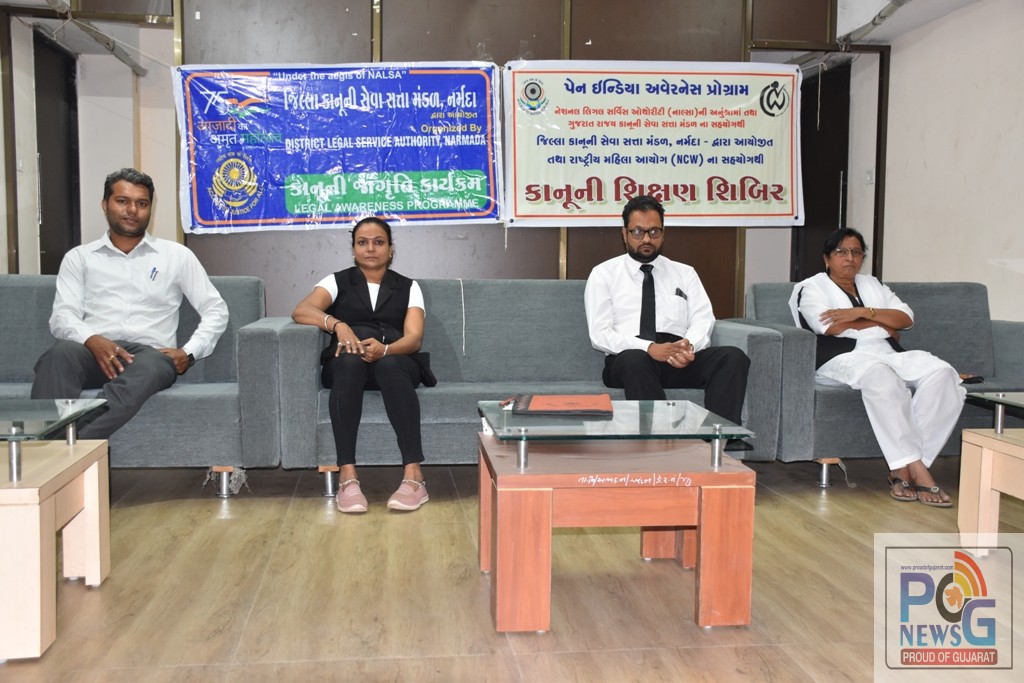 નેશનલ લીગલ સર્વિસીસ ઓથોરિટી, ન્યુ દિલ્હી તેમજ ગુજરાત રાજ્ય કાનૂની સેવા સત્તા મંડળ, અમદાવાદના માર્ગદર્શન હેઠળ નર્મદા જિલ્લા કાનૂની સેવા સત્તા મંડળ અને રાષ્ટ્રીય મહિલા આયોગના સંયુક્ત ઉપક્રમે મહિલાઓ સરળતાથી પોતાના હક્કો અને ફરજો વિશે પૂરતી જાણકારી મેળવી શકે તે હેતુસર આજે રાજપીપલામાં ડૉ.બાબા સાહેબ આંબેડકર હોલ ખાતે જિલ્લા કાનૂની સેવા સત્તા મંડળના સેક્રેટરી જે.એસ.રંગવાલા, પેનલ એડવોકેટ શ્રીમતી બી.એમ.રામી અને વકીલ કુ. કે.સી.માછી સહિત મહિલાઓની વિશાળ ઉપસ્થિતિમાં મહિલાઓને લગતા કાયદા કાનૂની શિક્ષણ શિબિરનો કાર્યક્રમ યોજાયો હતો.