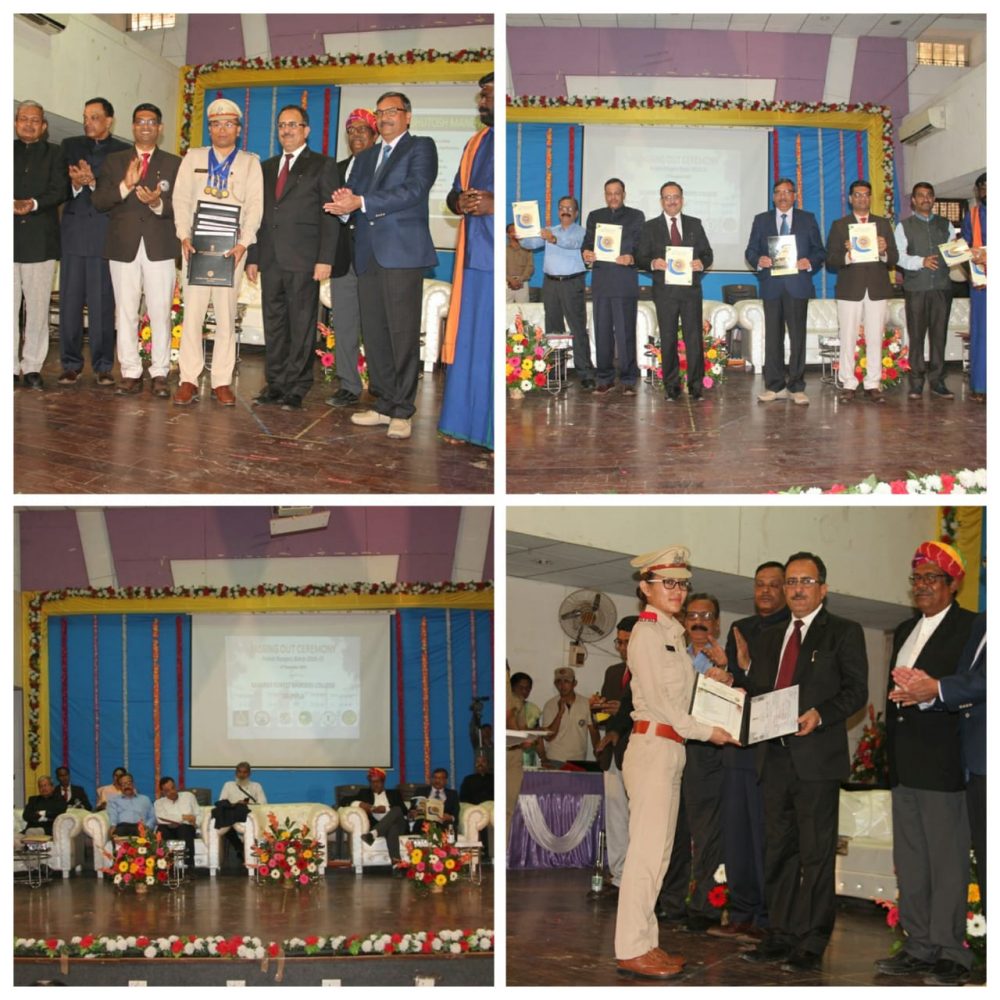 આ પ્રસંગે દહેરાદૂન ખોતના ફોરેસ્ટ એજયુકેશનના ડાયરેકટરશ્રી આર.પી. સિંઘ, ગુજરાતના અધિક અગ્ર મુખ્ય વનસંરક્ષક ડૅા. સંજીવ ત્યાગી, કોલેજના આચાર્ય ડૅા. કે.રમેશ વગેરેએ પ્રાસંગિક પ્રવચનો કર્યા હતા. આ પ્રસંગે કોલેજના આચાર્ય ડૅા. કે.રમેશે તેમના સ્વાગત પ્રવચનમાં સૌને આવકારી અભ્યાસ અહેવાલ રજૂ કર્યો હતો. જયારે તાલીમાર્થી શ્રી અવિનાશે તેમની તાલીમ દરમિયાનનો પ્રતિભાવ વ્યકત કર્યો હતો. ડૅા. કે.રમેશે આ સમારોહમાં તાલીમાર્થીઓને સામૂહિક શપથ લેવડાવ્યા હતા. ડૅા. ડી.કે.શર્મા સહિત ઉપસ્થિત મહાનુભાવોના હસ્તે તાલીમાર્થીઓને તાલીમ અંગેના પ્રમાણપત્રો એનાયત કરી તેમનું બહુમાન કરાયું હતું. ૩૪ તાલીમાર્થીઓમાંથી ૧૬ તાલીમાર્થીઓને ઓનર્સ એવોર્ડ અને ૧૭ તાલીમાર્થીઓને પાસ પ્રમાણપત્ર-એવોર્ડ એનાયત કરાયા હતા. આ સમારોહમાં છત્તીસગઢના બિલાસપુરના તાલીમાર્થીશ્રી આશુતોષ કુમાર માંડવાએ ઓવરઓલ ટોપરમાં ગોલ્ડ મેડલ તેમજ ફોરેસ્ટ્રી, ઇકોલોજી, ફોરેસ્ટ સર્વે એન્ડ એન્જીનિયરીંગ અને રેન્જ એડમિનિસ્ટ્રેશન સહિતના અન્ય ચાર વિભાગોમાં પણ સિલ્વર મેડલ મેળવ્યા હતા. એક સાથે પાંચ-પાંચ મેડલ મેળવનાર આશુતોષ માંડાવાનું ઉપસ્થિત મહાનુભાવોના હસ્તે વિશેષ અભિવાદન કરી પ્રોત્સાહિત કરાયાં હતા. આશુતોષ માંડવાએ તેમના પ્રતિભાવમાં જણાવ્યું હતું કે, રો-મટીરીયલ્સના રૂપમાં અહિં આવેલા અમે તાલીમાર્થીઓ આજે ઓફિસર્સનાં રૂપમાં જઇ રહ્યાં છે ત્યારે, તાલીમ દરમિયાનના અભ્યાસ પ્રવાસ સહિત શીખવા મળેલી ઘણી બધી બાબતોની સ્મૃતિ મારા જીવનમાં હંમેશ માટે યાદગારરૂપ બની છે. આ પ્રસંગે મુખ્ય મહેમાનપદે ડૉ. ડી.કે.શર્મા સહિતના મહાનુભાવોના હસ્તે સ્મૃતિગ્રંથનું પણ વિમોચન કરાયું હતું. અંતમાં ફોરેસ્ટ કોલેજના ઉપાચાર્ય આર.પી. ગેલોતે આભારદર્શન કર્યું હતુ.