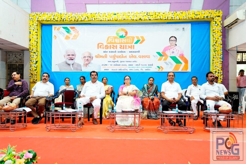 જિલ્લા પંચાયત પ્રમુખ પર્યુષાબેન વસાવા આજે રાજપીપલામાં સરદાર ટાઉન હોલ ખાતે ૨૦ વર્ષના વિશ્વાસ દ્વારા થયેલા વિકાસની ઉજવણી અંતર્ગત સમગ્ર ગુજરાતમાં પ્રાંત કક્ષાએ યોજાયેલા “વિશ્વાસથી વિકાસયાત્રા” ના રાજ્યવ્યાપી કાર્યક્રમના ભાગરૂપે જિલ્લાના રાજપીપલા પ્રાંત કક્ષાના યોજાયેલા કાર્યક્રમને દિપ પ્રાગટ્ય દ્વારા ખુલ્લો મુકતા બોલી રહ્યાં હતાં. આ પ્રસંગે પર્યુષાબેન વસાવાના હસ્તે અંદાજે રૂા.૬.૬૬ કરોડથી પણ વધુની રકમના ખર્ચે ૫૨૯ જેટલા વિકાસ કામોના ઇ-લોકાર્પણ અને ઇ-ખાતમુર્હૂતની ડિજીટલ માધ્યમથી ઉક્ત વિકાસ કામોની તકતીનું અનાવરણ કરાયું હતું. જેમાં રૂા.૪.૫૬ કરોડથી પણ વધુની રકમના ખર્ચે ૩૦૪ જેટલા વિકાસ કામોના ઇ-ખાતમુર્હૂત અને અંદાજે રૂા.૨.૦૯ કરોડથી વધુની રકમના ખર્ચેના ૨૨૫ જેટલા વિકાસ કામોના ઇ-લોકાર્પણનો સમાવેશ થાય છે.