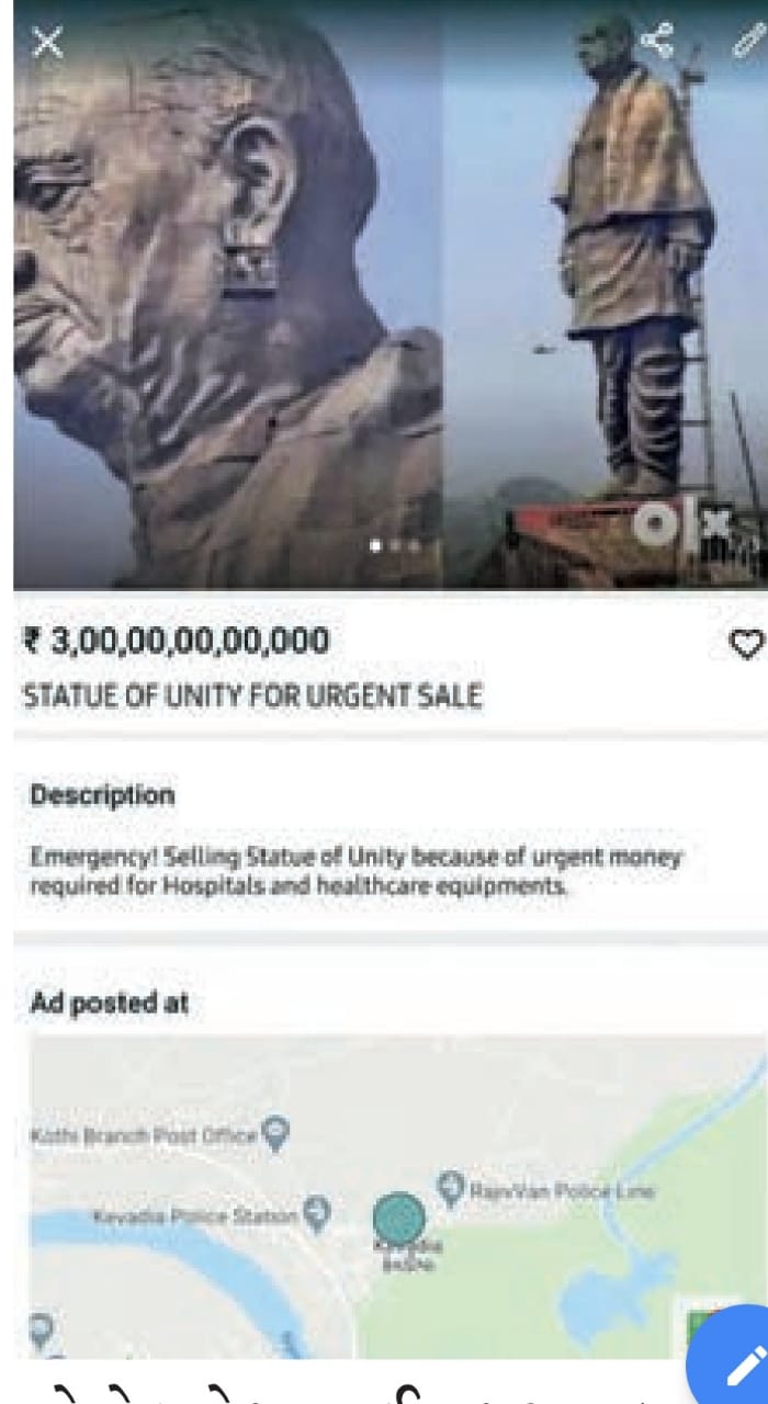 આજરોજ તા.૦૫/૦૪/૨૦૨૦ નાં રોજ ગુજરાતનાં એક દૈનિક અખબારમાં તાત્કાલિક ધોરણે હોસ્પીટલ અને મેડીકલ સાધનો ખરીદવા ફંડની જરૂર હોય માટે OLX વેબસાઇટ પર કોઇએ ૩૦ કરોડમાં સ્ટેચ્યુ ઓફ યુનિટી વેચવા મુકયુ હોવાનાં દાવાનાં શિર્ષક હેઠળ સમાચાર પ્રસિધ્ધ થયા છે. આ પ્રકારની પ્રવૃતીની ઉચ્ચકક્ષાએ ઘણી જ ગંભીર નોંધ લેવામાં આવી છે અને સત્યતાની ખરાઇ કરતા આવી પોસ્ટ કોઇ અજાણ્યા ઇસમે OLX પર મુકી હતી પરંતુ આ પોસ્ટ દૂર કરવામાં આવી હતી. આ અજાણ્યા ઇસમે સરકારની મિલકત સ્ટેચ્યુ ઓફ યુનિટીનાં વેચાણ કરવા પોતે અધિકૃત ન હોવા છતા સરકારને બદનામ કરવાનાં અને લોકોને ગેરમાર્ગે દોરવાનાં હેતુસર આ પ્રકારની જાહેરાત OLX વેબસાઇટ/પોર્ટલ પર મુકેલ સરદાર સાહેબ જેવા સ્વાતંત્ર્ય સંગ્રામનાં પ્રખર લડવૈયા અને અખંડ ભારતનાં શિલ્પી જેવા મહાન વ્યક્તિને સાચી શ્રધ્ધાંજલી આપવા અને આવનારી પેઢી સરદાર સાહેબનાં કાર્યોને જાણે તે માટે જ સરકારે પ્રતિમાનું નિર્માણ અત્રે કરેલ છે. ભારતની એકતાનાં પ્રતિક સમાન સરદાર સાહેબની સાથે કરોડો ભારતીયોની લાગની જોડાયેલી છે. આવા હિન કૃત્યથી ભારતીયોની લાગણીને ઠેશ પહોંચી છે. સમગ્ર બાબતે મુખ્ય વહીવટદાર નાં આદેશથી મામલતદાર પાર્થ જયસ્વાલે કેવડીયા પોલીસ સ્ટેશને યોગ્ય ધારાધોરણ મુજબ પોલીસ ફરીયાદ આપેલ છે. આ અંગે સ્ટેચ્યુ ઓફ યુનિટીનાં નાયબ મુખ્ય વહીવટદાર નિલેશકુમાર દુબે તરફથી એક વાતચિતમાં જણાવ્યુ હતુ કે, સ્ટેચ્યુ ઓફ યુનિટી વિશ્વમાં એકતાનાં પ્રતિક સમાન સરદાર સાહેબની વિશ્વની સૌથી ઉચી પ્રતિમાં છે અને સરદાર સાહેબનાં કાર્યોને આવનારી પેઢી જાણી શકે તે માટેનાં શુભ આશયથી આ પ્રતિમાનું નિર્માણ થયેલ છે. ત્યારે આ પ્રકારની વાહીયાત કરતુતથી ભારત દેશની જનતાની લાગણીને ઠેશ પહોચાડવાનો એક બદઇરાદાપુર્વકનો પ્રયાસ છે તેમજ OLX જેવી જાણીતી વેબસાઇટ દ્રારા પણ આ અંગેની ખરાઇ કે ચકાસણી કર્યા વિના જ આ પોસ્ટને એપૃવલ આપવામાં આવે તે ઘણી જ દુ:ખની બાબત છે.
