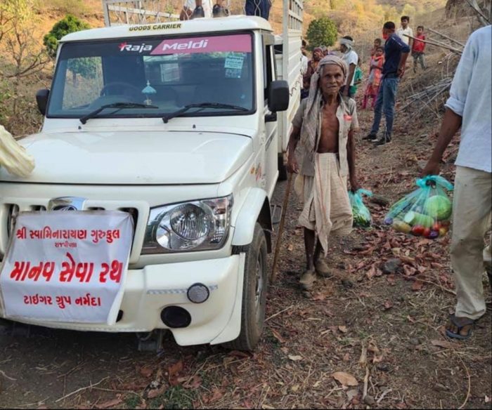 હાલ કોરોનાની વૈશ્વિક મહામારીનાં કારણે દેશમાં લોક ડાઉન અમલમાં છે ત્યારે આજે સતત 61 માં દિવસે પણ નર્મદા જિલ્લાના અંતરિયાળ ગામડાઓમાં લોકોને જીવન જરૂરિયાત ચીજવસ્તુઓની કિટો બનાવી વડતાલનાં વિહારી હરિકૃષ્ણ મહારાજ તેમજ શ્રીસ્વામિનારાયણ ગુરુકુલ રાજપીપલાનાં શ્રી સિધ્ધેશ્વર સ્વામીજીનાં માર્ગદર્શન હેઠળ ચાલતો માનવ સેવા રથ દ્વારા નર્મદા જિલ્લામાં હજી પણ એવા ગામ છે જ્યાં લોકો પ્રાથમિક સુવિધાઓથી વંચિત છે એવા 4 પહાડી ગામોમાં જ્યાં વાહનો જઈ શકતા નથી ત્યાં ટાઇગર ગ્રુપમાં કાર્યકરો પગદંડી જઈ આખા ગામમાં શાકભાજીની કીટ અને જરૂરિયાતમંદ પરિવારને અનાજની કીટનું વિતરણ કરવામાં આવ્યું હતું.