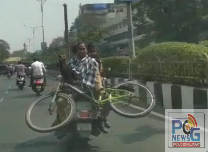 સુરતની એમ.ટી.બી કોલેજની વિદ્યાર્થિનીઓ મોપેડ પર જોખમી રીતે ડ્રાઇવિંગ કરતી હોય તેવો વિડીયો વાયરલ થયો છે. એક જ મોપેડ પર 4 વિદ્યાર્થીનીઓ ટ્રાફિકના નિયમોને નેવે મૂકીને જતી હોય તેવા દ્રશ્યો સુરતના રસ્તા ઉપર જોવા મળ્યા છે.