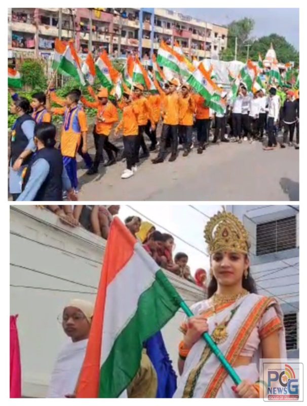 “આઝાદી કા અમૃત મહોત્સવ” અંતર્ગત ભારત સરકાર દ્વારા “હર ઘર તિરંગા” અભિયાન ચલાવવામાં આવી રહ્યું છે. “હર ઘર તિરંગા” અભિયાન હેઠળ ભારત સરકાર દ્વારા દરમિયાન તમામ નાગરીકને તેમના ઘર ઉપર રાષ્ટ્રધ્વજ ફરકાવવા માટે પ્રોત્સાહિત કરવામાં આવી રહ્યા છે. PM મોદીએ ટ્વિટ કરીને લોકોને ‘હર ઘર તિરંગા અભિયાન’ને મજબૂત કરવાની અપીલ કરી છે. તારીખ 13 થી 15 ઓગસ્ટ વચ્ચે પોતાના ઘર પર રાષ્ટ્રધ્વજ લહેરાવવા PM એ અપીલ કરી છે ત્યારે સરકારના આ અભિયાન અંતર્ગત સુરતના કીમ ચાર રસ્તા વિસ્તારમાં તિરંગા યાત્રાનું આયોજન કરવામાં આવ્યું હતું જેમાં વિદ્યાર્થીઓ દ્વારા હાથમાં તિરંગા લઇ દેશભક્તિના નારા સાથે રેલી કાઢવામાં આવી હતી.