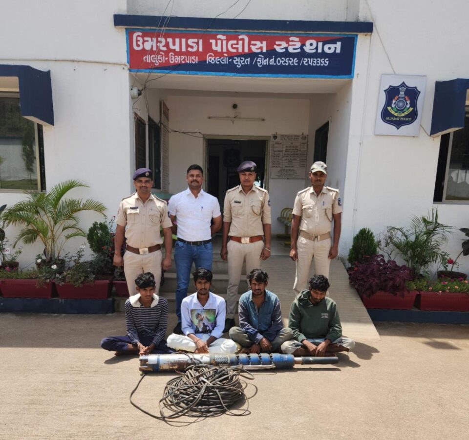 ઉમરપાડા તાલુકાના વક્રાંત આંબા ગામની સીમ માંથી સોલાર સબમર્સીબલ મોટરની ચોરી કરનારા ચાર આરોપીને પોલીસે ગણતરીના કલાકોમાં મુદ્દામાલ સાથે ઝડપી પાડ્યા હતા. વક્રાંત આંબા ગામના ખેડૂત મગનભાઈ સિંગાભાઈ વસાવાના ખેતરમાં આવેલ કુવામાંથી સોલર સબમર્સીબલ મોટર અને વાયરની ચોરી થઈ હતી જેથી તેમણે ઉમરપાડા પોલીસ મથકમાં ફરિયાદ નોંધાવી હતી, ત્યારબાદ ઉચ્ચ અધિકારીની સુચનાઓથી પોલીસે આ દિશામાં તપાસ શરૂ કરતા પો.સ.ઇ બી.એસ ગામીત અને હે. કો.રણજીતભાઈ ભંગિયાભાઈને સંયુક્ત બાતમી મળી હતી કે ચોરી થયેલ મોટર જુમાવાડી ગામના વડ ફળિયામાં રહેતા જેઠીયાભાઈ ગમાભાઈ વસાવાના ઘરે છે જેના આધારે પોલીસ કર્મચારીઓ હે.કો. પ્રફુલભાઈ સાકરભાઇ,નો.પો.કો. ધર્મેશભાઈ દિનેશભાઈ,પો.કો. સુરેશભાઈ માનસિંગ,પો.કો. ગોપાલભાઈ ભગતભાઈ વગેરેની ટીમે ઉપરોક્ત સ્થળે તપાસ કરતા સોલર મોટર, થ્રી ફેઝ વાયર સહીત કુલ ₹35,000 નો મુદ્દામાલ પોલીસે કબજે લીધો હતો સાથે આરોપીઓ દીપકભાઈ જેઠીયાભાઈ વસાવા, હિતેશભાઈ નરપતભાઈ વસાવા, વિશાલભાઈ નરપતભાઈ વસાવા, વિજયભાઈ નરપતભાઈ વસાવા તમામ રહે. જુમાવાડી ગામ તાલુકો ઉમરપાડા સહિત ચાર આરોપીઓને ઝડપી લીધા હતા.