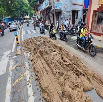 સુરતનાં નાનપુરા વિસ્તારમાં જાહેર રસ્તા પર પડેલી પીળી ચીકણી માટી વાહન ચાલકો માટે આફતરૂપ બની ગઈ છે. આ જગ્યાએ અનેક વાહનો સ્લીપ થતાં આ વિસ્તારમાં ટ્રાફિક જામ થઈ ગયો હતો. પાલિકાએ સાધનોની મદદથી રસ્તા પરથી કીચડ દુર કરવાની કામગીરી શરૂ કરી છે. જોકે, હાલમાં મેટ્રોની કામગીરી અને રસ્તા પર કાદવના કારણે સુરતીઓની મુશ્કેલી વધી રહી છે.