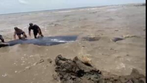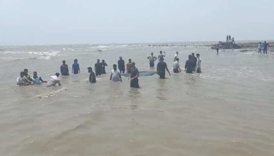 ઓલપાડના મોર ગામના દરિયાકાંઠે કાદવમાં ફસાયેલ વ્હેલ માછલી દરિયાઈ ભરતીના પાણીમાં તરતી કરાઈ