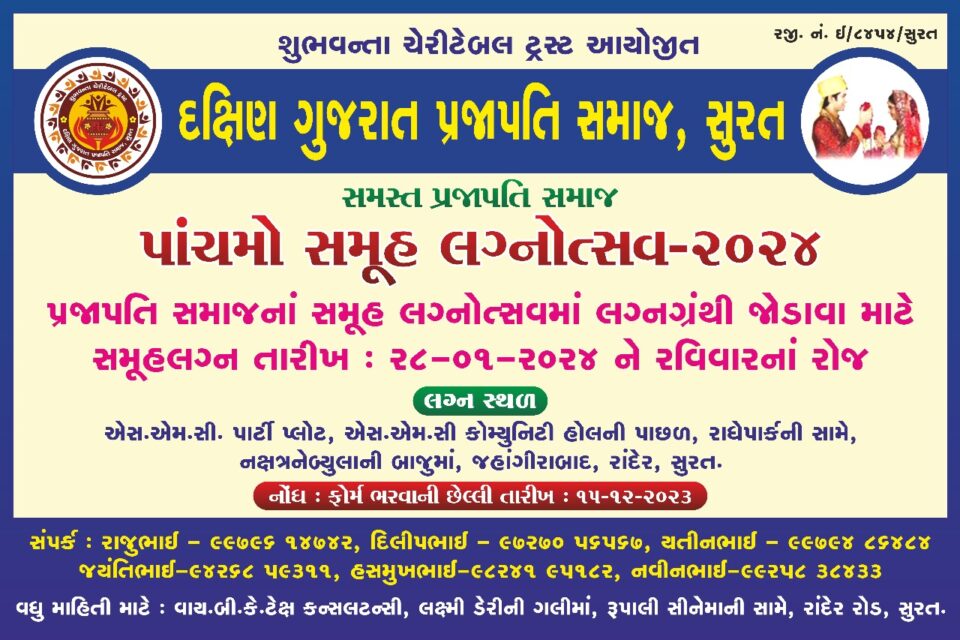 શુભવન્તા ચેરીટેબલ ટ્રસ્ટ સંચાલિત દક્ષિણ ગુજરાત પ્રજાપતિ સમાજ, સુરત આયોજીત પાંચમો સમૂહ લગ્નોત્સવ – ૨૦૨૩ ” ઉંબરે ઉભી સાભળુ રે બોલ વાલમના.. ”દક્ષિણ ગુજરાત પ્રજાપતિ સમાજ, સુરતના પાંચમો સમૂહ લગ્નોત્સવ – ૨૦૨૩ તા. ૨૮/૦૧/૨૦૨૪ને રવિવારના રોજ એસ. એમ. સી. પાટીૅ પ્લોટ,નક્ષત્ર-નેબ્યુલાની પાસે,રાધે પાકૅ સોસા. સામે, જહાંગીરપુરા ખાતે યોજાશે. સુરત, ભરૂચ, વલસાડ, નવસારી, નમૅદા અને તાપી જિલ્લાના પ્રજાપતિ સમાજના જોડાઓ તેમા જોડાઇ શકે છે. ફોમૅ ભરવાની છેલ્લી તારીખ ૧૫/૧૨/૨૦૨૩ રહેશે. સમાજના જ્ઞાતિજનો ગરીબ – તવંગર તમામને સમૂહ લગ્નોત્સવમા જોડાય સમાજના આ કાયૅને વેગવંતુ બનાવે તેમજ સમાજની ધનરાશિની બચત કરી પોતાના સંતાનોના શિક્ષણના ઉત્કષૅ તેમજ સમાજના કલ્યાણ માટે ઉપયોગ કરે એવી હાકલ કરવામા આવે છે.
