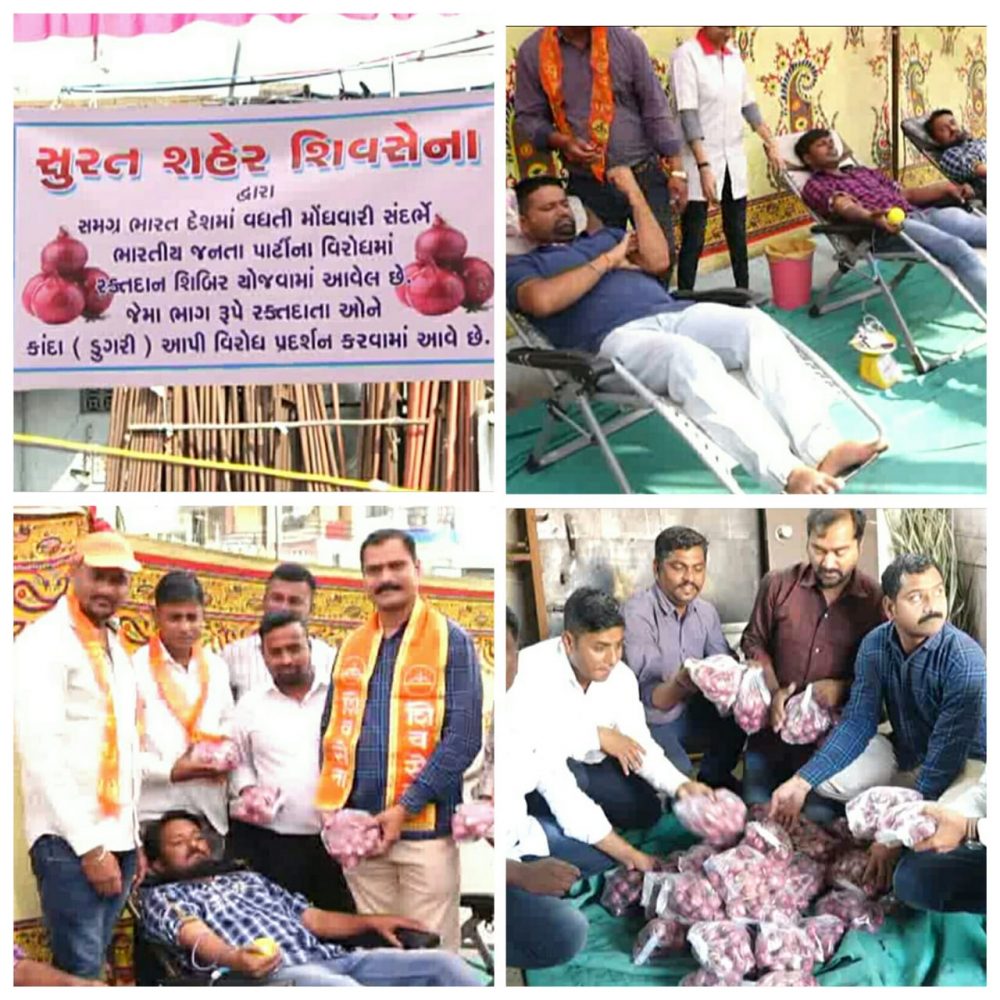 સુરત શિવસેનાના કાર્યકર્તાઓ ડુંગળીના ભાવ વધારાના વિરોધમાં સુરત ખાતે અનોખું વિરોધ પ્રદર્શન કર્યું હતું. સુરત શિવસેના દ્વારા આજરોજ રકતદાન શિબિરનું આયોજન કરવામાં આવ્યું હતું અને રકતદાતાઓને એક કિલો ડુંગળીનું વિતરણ કરવામાં આવ્યું હતું.