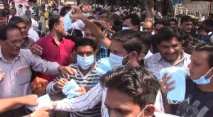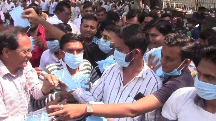 સુરત : વરાછાની મિનિ બજાર ખાતે રત્નકલાકારોને મફતમાં માસ્ક વિતરણ કરવામાં આવ્યું હતું.