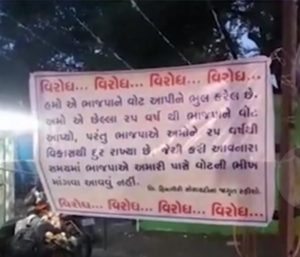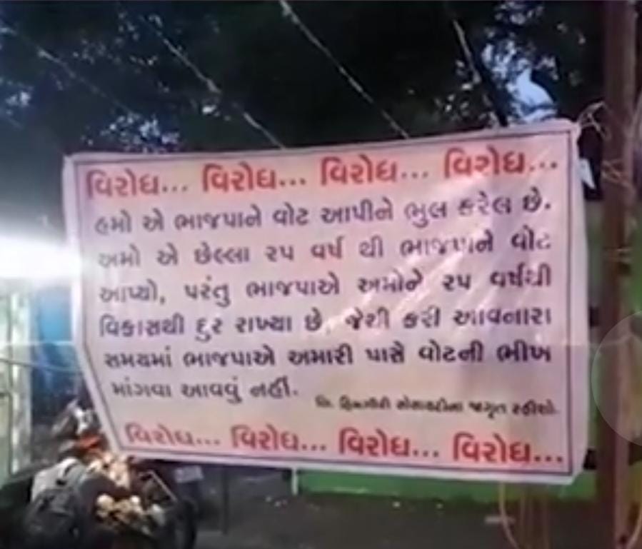 અડાજણ વિસ્તારની હિમગિરિ સોસાયટીના લોકોએ બેનરમાં ભાજપને વોટ આપીને ભૂલ કરી હોવાનાં લખાણો લખ્યાં છે. 25 વર્ષથી કોઈપણ સ્વાર્થ વગર ભાજપના પડખે ઊભા રહીને તેમને સત્તા પર આરૂઢ કરવામાં હિમગિરિ સોસાયટીના લોકોએ યોગદાન આપ્યું છે. વોટ સમયે ભાજપના નેતાઓ વારંવાર તેમની સોસાયટીઓમાં આવીને ભાજપ તરફી વોટ કરવા માટે સમજાવે છે અને વચન આપે છે. તેમના શાસનમાં વિકાસ કામોને લઈને કોઈપણ પ્રકારની કસર રહેશે નહીં, પરંતુ આજે સ્થાનિક હિમગિરિ સોસાયટીના લોકોએ બેનરો લગાડીને પોતાનો વિરોધ નોંધાવ્યો છે.સોસાયટીના રસ્તાઓનું કામ થયું નથી હિમગિરિ સોસાયટીના લોકો બેનરમાં લખ્યું છે કે 25 વર્ષથી અમારી સોસાયટીના રસ્તાઓનું કામ થયું નથી. વારંવાર સોસાયટીના પ્રમુખ બદલાતા રહે છે. તેમના દ્વારા છેલ્લાં 15 વર્ષથી દરેક પ્રમુખ દ્વારા કોર્પોરેશનના અધિકારીઓને રસ્તા બાબતે ફરિયાદ કરવામાં આવે છે, પરંતુ આશ્ચર્યની વાત એ છે કે પંદર વર્ષ સુધી એકપણ નેતાએ અધિકારીઓ સાથે મળીને આ વિસ્તારનું કામ પૂર્ણ કર્યું નથી.