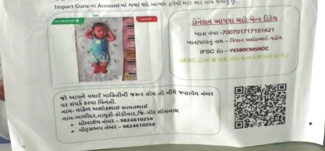 થોડા સમય અગાઉ sma નામની બીમારી ધૈર્યરાજ નામના બાળકને થઈ હતી જેમાં ગુજરાતે ખભે ખભો મિલાવી દાન આપી 16 કરોડની કિંમતના ઇન્જેક્શનનું ફંડ એકત્રિત કરી ધૈર્યરાજનો જીવ બચાવ્યો હતો. તેવી જ એક ઘટના ફરી સામે આવી છે ગીર સોમનાથના આલિદર ગામે સામે આવ્યો છે. આલિદર ગામ માં સામાન્ય પરિવાર માંથી આવતા અશોકભાઈ વાઢેરના પુત્ર વિવાનને sma નામની બીમારી થયા પરિવાર માથે આફત આવી પડી હતી.