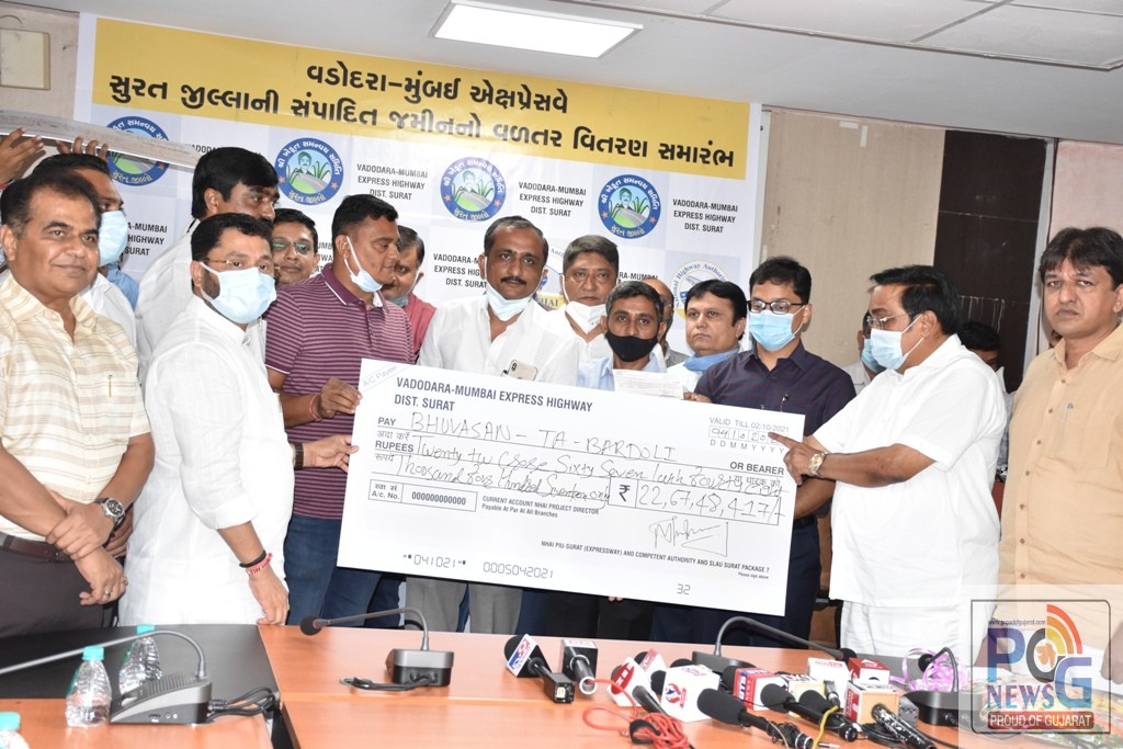 સુરત જિલ્લામાંથી પસાર થતા વડોદરા-મુંબઈ એક્સપ્રેસ-વે ના નિર્માણ માટે સંપાદિત જમીન માટે ખેડુત ખાતેદારોને સાંસદ સી.આર.પાટીલ અને પૂર્વમંત્રી અને ધારાસભ્ય ઈશ્વરભાઈ પરમાર, જિલ્લા કલેકટર આયુષ ઓકના હસ્તે બારડોલી તાલુકાના નિણત, નોગામા અને ભુવાસણ ગામના ૨૮ ખેડુત ખાતેદારોને રૂા.૪૨ કરોડના વળતરના ચેકો એનાયત કરીને વળતર આપવાનો પ્રારંભ કરાયો હતો.