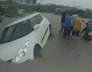 સુરેન્દ્રનગરમાં છ ઈંચ જેટલો વરસાદથી શહેરના અનેક નીચાણવાળા વિસ્તારોમાં પાણી ભરાઇ જવાની સમસ્યા સર્જાઇ છે, અને છેવાડાનાં વિસ્તારોમાં પણ વરસાદી પાણી ભરાતા સ્થાનિક વાહન ચાલકોને પારાવાર મુશ્કેલી ઊભી થવા પામી છે. ત્યારે શહેરની નૂરે મહમ્મદ સોસાયટી પાસે રસ્તા ઉપરથી પસાર થતી કાર પાણીના પ્રવાહમાં ફસાઈ ગઈ હતી. ફસાયેલી કારને બહાર કાઢવા જેસીબીની મદદથી રેસ્ક્યુ હાથ ધરાયું હતું. મહા મહેનતે જેસીબીની મદદથી પાણીના પ્રવાહમાં ફસાયેલ કારને બહાર કાઢવામાં આવી હતી. આ બનાવમાં સદનસીબે કોઇ જાનહાની ન થવા પામી હોવાનું જાણવા મળ્યું છે.
