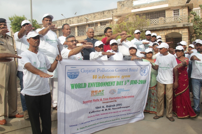 લોકોમાં પર્યાવરણીય જાગૃતિ કેળવાય અને પર્યાવરણની જાળવણી થાય તે માટે તા.૫ મી જૂન-૨૦૧૮ના રોજ સવારે ૮-૦૦ કલાકે કલેકટર કચેરી ખાતેથી પર્યાવરણીય જન જાગૃતિ રેલી(સ્કુયટર રેલી)નું આયોજન કરવામાં આવેલ હતું. આ રેલીને ધારાસભ્યકશ્રી ધનજીભાઇ પટેલે લીલીઝંડી આપી પ્રસ્થાસન કરાવ્યુંા હતું. આ રેલી પર્યાવરણ બચાવો અંગેના વિવિધ બેનરો સાથે સુરેન્દ્રીનગર તથા વઢવાણના મુખ્યી માર્ગો પર પસાર થઈ ધોળીધજા ડેમ ખાતે પૂર્ણ થયેલ હતી. ધારાસભ્યિશ્રી ધનજીભાઇ પટેલ તેમજ ઉપસ્થિ ત મહાનુભાવોના હસ્તેે ધોળીધજા ડેમ સાઇટ ખાતે વૃક્ષારોપણ પણ કરવામાં આવેલ હતું. પ્લાથસ્ટીાકનો વિવેકપૂર્ણ ઉપયોગ કરી પર્યાવરણ બચાવવા અંગેના ઉપસ્થિરત દરેકે શપથ ગ્રહણ કર્યા હતાં.