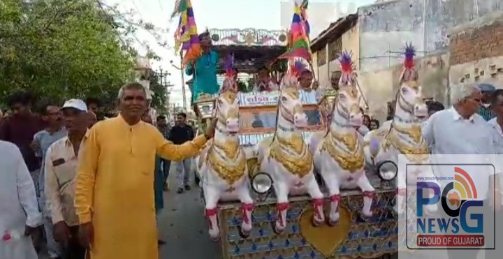 હાલના કળયુગમાં કહેવાય તો પીરોના પીર એટલે નવનેજા વાળા લીલુડા ઘોડસવાર એવા રામદેવપીર ત્યારે આજે ડીજેના તાલે લીલુડા નેજાવાળા એવા પીર રામદેવપીરનો વરઘોડો સ્ટેશન રોડ પર આવેલ પાવરહાઉસના સર્વગુણ સોસાયટીમા રામદેવપીરનો પાટોત્સવનો વરઘોડો નીકળ્યો હતો ત્યારે રામાપીરની જગ્યા રંગપુરના મહંત જયદેવ મહારાજ અને વડોદના તુલસીદાસ મહારાજ હાજર રહ્યા હતા ત્યારે ડીજેના તાલે આ વરઘોડો કાઢવામાં આવ્યો હતો અને રામભકતો કરતાલ સાથે ઝુમી ઉઠ્યા હતા અને શ્રધ્ધાસબુરી સાથે આ વરઘોડામાં લોકો જોડાયા હતાં.