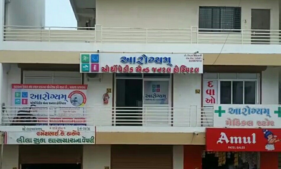 = ઘૂંટણ કમર તથા સાંધાનનો દુ:ખાવો તેમજ હાડકા તથા સ્નાયુને લગતા બધા જ રોગોનુ સચોટ નિદાન તથા સારવાર પણ થાય છે. આરોગ્યમ હોસ્પિટલમા 24 કલાક ઇમરજન્સી સારવાર ઉપલબ્ધ છે લેબોરેટરી, ડીજીટલ એક્ષ-રે સુવિધા * ઈન હાઉસ ફાર્મસી ( દવાઓ ) તથા 15 બેડની સુવિધા સાથે સેમી સ્પેશિયલ તથા જનરલ વૉર્ડ પણ સામેલ છે.
