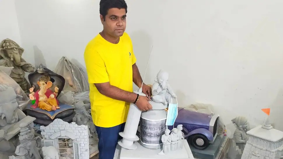 રાજ્ય સરકારે ગણેશ ઉત્સવની મંજૂરી આપી છે, સાથે જ મૂર્તિકારોને 4 ફૂટ સુધીની જ મૂર્તિ બનાવવા માટે આદેશ કર્યો છે, ત્યારે વડોદરાના તરસાલીના શિક્ષિત દક્ષેશ જાંગીડ મૂર્તિકારે વિવિધ થીમ આધારિત ગણેશજીની મૂર્તિ બનાવી છે. જેમાં દક્ષેશે ત્રણ અલગ અલગ પ્રકારની મૂર્તિઓ બનાવી છે. જેમા પ્રથમ મૂર્તિમાં ગણેશજી કોરોનાની વેક્સીન તથા માસ્ક સાથે નજરે પડે છે. સાથે જ કોરોના વોરિયર્સ પણ આ મૂર્તિમાં નજરે પડે છે. આમ કોરોનાની સંભવીત ત્રીજી લહેરથી બચવા અને તેને રોકવા માટે વેક્સીન જ અક્સીર ઇલાજ છે તેથી વેક્સીન લેવી જોઇએ અને માસ્ક અવશ્ય પહેરવું જોઇએ તેવો સંદેશો આપતા ગણેશજી દેખાય છે.