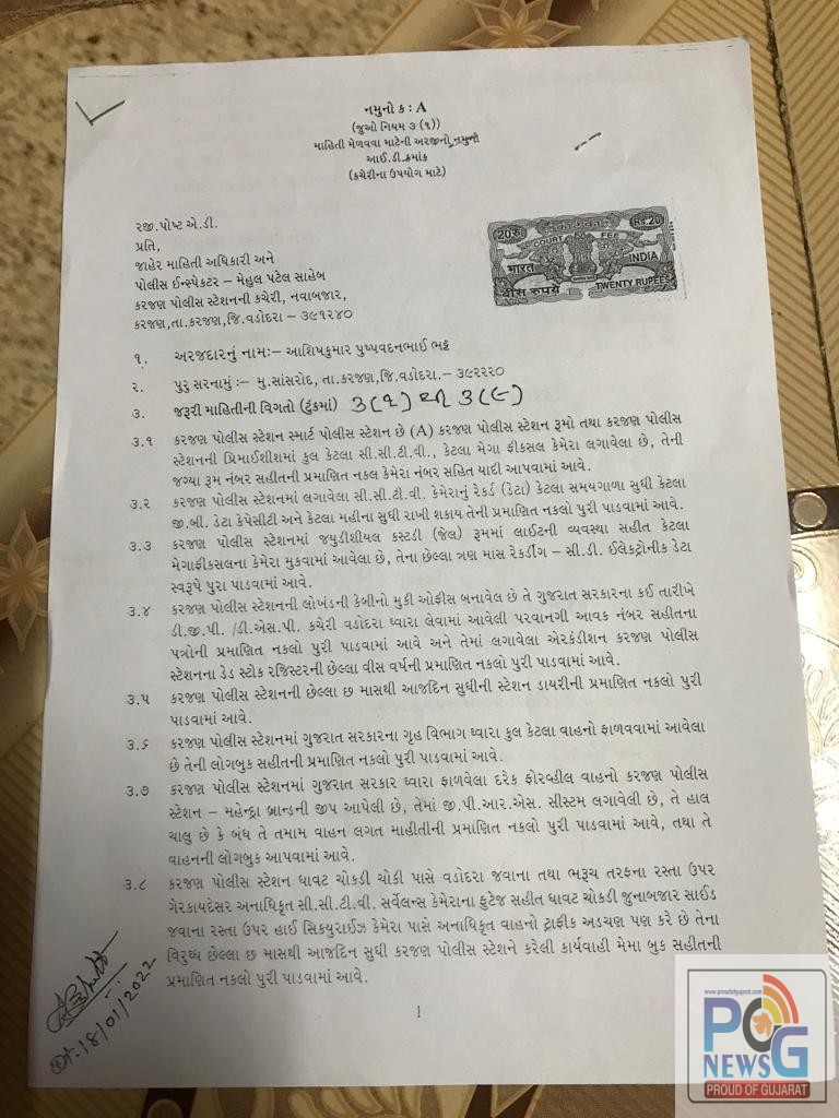 કરજણ પોલીસ સ્ટેશનના જવાબદાર અધિકારી પાસે કરજણ જુનાબજાર ઘાવટ ચોકી પાસે વડોદરા, ભરૂચ અને જુનાબજાર તરફ જવાના રસ્તા ઉપર ટ્રાફિક સમસ્યા ઊભી કરતાં અડચણરૂપ અનાધિકૃત વાહનો વિરુદ્ધ છેલ્લા છ માસથી અત્યારસુધી કરજણ પોલીસે કરેલી કાર્યવાહી, સ્ટેશન ડાયરી રેકોર્ડ તેમજ લગાવેલ સી.સી.ટી.વી કેમેરાને લગતી તમામ માહિતી સહિતનું આર.ટી.આઈ. હેઠળ પ્રમાણિત નકલો માંગતા પોલીસ બેડામાં સોંપો પડી જવા પામ્યો છે.