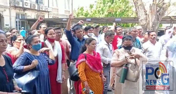 વડોદરા મહાનગરપાલિકા દ્વારા વહીવટી વોર્ડના કર્મચારીઓની બદલી કરાતા સૂત્રોચ્ચાર કરી વિરોધ દર્શાવ્યો.
