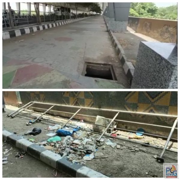 દાંડિયાબજાર જંકશનથી શરૂ થતાં રોડ પર શનિદેવ મંદિરથી આગળ જતાં ફુટપાથ પર ગટરના ઢાંકણા ઉંચા થઈ ગયા છે. પગપાળા જતાં રાહદારીઓ ઠોકર ખાઈ પડી શકે છે. જયારે સોલાર પેનલ નીચે લગાવેલી સ્ટૅનલેશ સ્ટીલની રેલીંગ પણ નીકળી ગઈ છે. રેલીંગ ગમે તે ઘડીએ રોડ પર ઢળી પડે એમ છે. આ રોડ પરથી રોજના હજારો વાહનો પસાર થાય છે એવામાં રેલીંગ રોડ પર પડે અને એ સમયે જ ત્યાંથી વાહન પસાર થતું હોય તો કલ્પના કરો કેવો અકસ્માત થાય ? આવી જ રીતે સોલાર પેનલ નીચે ખુલ્લી ગટરમાં ત્યાંથી પસાર થતા રાહદારી પડી જાય તો શું થાય ? અહીં મહત્વનું એ છે કે ચોમાસું માથે છે ત્યારે આવી ઘોર બેદરકારી કોઈ નિર્દોષ નો ભોગ લઈ શકે છે. અત્રે ઉલ્લેખનીય છે કે આગામી ૧૮ જૂને વડાપ્રધાન નરેન્દ્ર મોદી વડોદરા આવવાના ત્યારે આવી ઘોર બેદરકારી કેટલી યોગ્ય છે ? શું કોઈ દુર્ઘટના બાદ તંત્ર જાગશે ? આવા અનેક સવાલોના જવાબ તંત્રએ આપવા પડશે.
