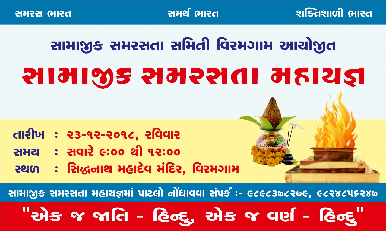 સામાજિક સમરસતા સમિતી વિરમગામ તાલુકાના સંયોજક શ્રી ભુપેન્દ્રભાઇ પટેલે જણાવ્યુ હતુ કે, બધા હિન્દુઓ એક જ માતા (ભારતમાતા)ના સંતાન છે, કોઇ પણ હિન્દુ નીચો નથી, હીન્દુ રક્ષા એ આપણી દિક્ષા (સંકલ્પ) છે તથા સમાનતા એ આપણો મંત્ર છે. પરમકૃપાળુ પરમાત્માના દિવ્ય આશીર્વાદ થી આપણા વિરમગામ તાલુકામાં ઇશ્વરીય કાર્ય રૂપી 21 કુંડી સામાજીક સમરસતા મહાયજ્ઞનું સિધ્ધનાથ મહાદેવ મંદિર વિરમગામ ખાતે તારીખઃ- 23/12/18 ને રવિવાર,સમય: સવારે 9.00 થી 12.00 સુધી ભવ્ય આયોજન આવેલ છે. આ પાવન અવસર ને અતિ પાવન કરવા ચોક્કસ થી પધારશોજી. આ સામાજિક સમરસતા મહાયજ્ઞમાં સૌરાષ્ટ્રના સામાજિક સમરસતા સંયોજક મહિપાલજી ઠાકુર વક્તવ્ય આપશે. આ ઉપરાંત પ.પુ. શ્રી જાનકીદાસ બાપુ, ભાણસાહેબની જગ્યા,કમીજલા, પ.પુ. શ્રી રામકુમારદાસ બાપુ, રામ મહેલ મંદિર, વિરમગામ, પ.પુ. શ્રી દિનબંધુ મહારાજ,આનંદ આશ્રમ, વનથળ, પ.પુ. શ્રી રઘુવીર સ્વામી,સોકલી ગુરુકુલ, પ.પુ. શ્રી રઘુનંદનદાસ ખાકી, પંચદેવ હનુમાનજી મંદિર, વિરમગામ, પ.પુ. શ્રી વસંતદાસ કાળીદાસ સાધુ, માનવ સેવા આશ્રમ, સરસાવડી,પ.પુ. શ્રી ભાણદાસ બાપુ ગૂરૂ દલુરામ સાધુ, રાધાકૃષ્ણ મંદિર,ભરવાડી દરવાજા વિરમગામ સહિતના સંતો મહંતો ઉપસ્થિત રહીને આશિર્વાદ આપશે. સામાજિક સમરસતા મહાયજ્ઞમાં મોટી સંખ્યામાં લોકો ઉપસ્થિત રહેશે.