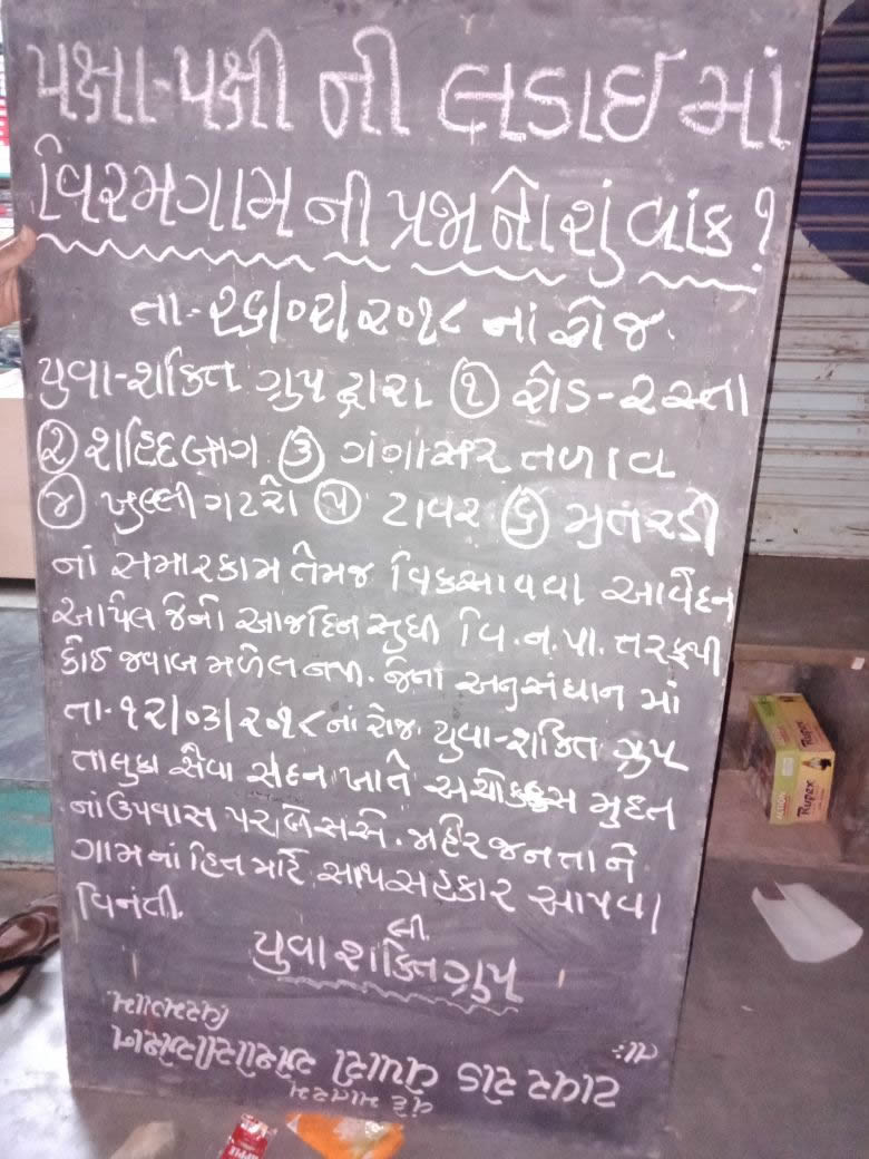 વિરમગામ શહેરમાં નગરપાલિકાના વિસ્તારને લગતી વિવિઘ સમસ્યાઓ ને લઇને વિરમગામ યુવા શક્તિ ગૃપ દ્વારા વિરમગામ મામલતદાર અને ચીફ ઓફિસર આવેદન પત્ર પાઠવ્યું હતું. જેમા વિરમગામ ના રોડ રસ્તા અને પેવરબ્લોક કામગીરીમાં મુલ્યાંકન અને મોનટરીંગ કરવામાં આવે,વિરમગામ શહેરના શહિદ બાગ ના રિનોવેશન માટે અસંખ્ય ગ્રાન્ટો ફાળવવામાં આવી છે જેને વહેલી તકે સુશોભિત કરવામાં આવે,વિરમગામ શહેરની ખુલ્લી વરસાદી ગટર ગંદકી સાફ કરાવવામાં આવે છે, શહેરમા પે એન્ડ યુઝ જાહેર શૌચાલય ચાલુ કરાવવામાં આવે ,શહેરના ભરવાડી દરવાજા,પાન ચકલા,ચોક્સી બજાર સહિત ઉભરાતી ભૂગર્ભ ગટર ના દૂષિત પાણી રસ્તા પર ફરીવળતા ભારે હાલાકી ભોગવવી પડે છે જે સમસ્યાઓ દૂર કરવી,ઐતિહાસિક ગંગાસર તળાવમાં ઘણા સમયથી જંગલી વેલ ઉગી નીકળી છે.જેને દૂર કરવી,વિરમગામ શહેરના ટાવર ની હાલત જર્જરીત છે. તેને સમારકામ કરી ઘડીયાળ નુ કામ કરાવવું. ઉપયુક્ત સમસ્યાઓને દિવસ 15 સુઘીમાં નિકાલ કરવામાં નહીં આવે તો આગામી 12 માર્ચ ના રોજ યુવા શક્તિ ગૃપ ના 200 સભ્યો તાલુકા સેવા સદન બહાર અચોક્કસ મુદત ના ઉપવાસ પર બેસવાની ફરજ પડશે જેની સંપૂર્ણ જવાબદારી ચીફ ઓફિસર,કાઉન્સિલરોને રહશે.સહિત ની રજુઆત સાથે વિરમગામ યુવા શક્તિ ગૃપ ના ગૌરવ શાહ,આશીષ ગુપ્તા,આરીફ સંઘી,મહંહદ બાપુ દિવાન,રણછોડ જાદવ,અનીલ ભરવાડ,દર્શન ઠક્કર,ભાવેશ સોલંકી,દિગેશ પુજારા સહિત ના સભ્યો એ વિરમગામ મામલતદાર અને ચીફ ઓફિસર ને આવેદન પત્ર પાઠવ્યું હતું.જેને લઇને કોઇ કાર્યવાહી ન કરતાં વિરમગામ યુવા શક્તિ ગૃપ દ્વારા આગામી 12 માર્ચ ના રોજ તાલુકા સેવાસદન ખાતે અચોક્કસ મુદત ના ઉપવાસ આંદોદન પર બેસવાના છે.જેને ઉપવાસ આંદોલન ઘરણા ને વિરમગામ કરણીસેના,ઠાકોર સમાજ ,દલિત સમાજ,પરશુરામ સેના સહિત ના ઓએ ઉપવાસ આંદોલન ને ખુલ્લો ટેકો જાહેર કર્યો હતો.