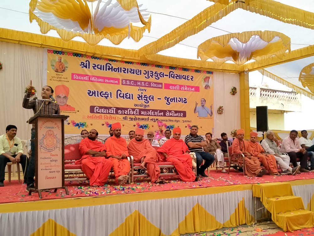 સ્વામિનારાયણ ગુરૂકુળ વિસાવદર તેમજ આલ્ફા વિદ્યા સંકુલ જૂનાગઢ દ્વારા આયોજિત વિદ્યાર્થી પ્રતિભા સન્માન સમારોહ તેમજ S.S.C, H.S.C. વિદ્યાર્થીઓનો વિદાય સમારોહ યોજાયો. જેમાં શા.સ્વા.શ્રી આનંદસ્વરૂપદાસજી તેમજ સંતો દ્વારા દીપ પ્રાગટ્ય કરવામાં આવ્યો હતો.