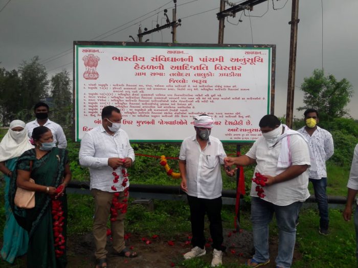 ઝઘડીયા તાલુકાની તલોદરા, ફૂલવાડી, વંઠેવાડ, દધેડા, લીંભેટ પંચાયત દ્વારા ભારતીય સંવિધાનની પાંચમી અનુસૂચિ હેઠળનો આદિજાતિ વિસ્તાર જાહેર કરી ગ્રામસભામાં બોર્ડ લાગવવાનો ઠરાવ કરવામાં આવ્યો છે. પંચાયત દ્વારા પંચાયતની હદમાં પાંચમી અનુસૂચિ હેઠળનો આદિજાતિ વિસ્તાર તેવા બોર્ડ લગાવી પાંચમી અનુસૂચિ, વેદાતા જજમેન્ટ, સમતા જજમેન્ટ અને અનુચ્છેદો બોર્ડમાં ટાંકવામાં આવ્યા છે. આ પ્રસંગે ગુજરાત ટ્રાઇબલ એડવાઈઝરી કમીટીના સભ્ય અને ડેડીયાપાડાના ધારાસભ્ય મહેશ વસાવા, બીટીપીના રાષ્ટ્રીય મહાસચિવ દિલિપ વસાવા ઉપસ્થિત રહ્યા હતા.છેલ્લા કેટલાક વર્ષોથી અનુસૂચિ ૫ ની સંપૂર્ણ અમલવારી કરવા સરકાર સમક્ષ અનેક રજૂઆતો આવેદનપત્રો તથા આંદોલનો થવા પામ્યા છે. અનુસૂચિ ૫ અને શિડયુલ ૬ ના અમલ સરકાર પાસે કરાવવા માટેની ઝુંબેશનુ મુખ્ય સેન્ટર ઝઘડિયા તાલુકો છે. ઝઘડિયાના ધારાસભ્ય છોટુભાઈ વસાવા દ્વારા અનુસૂચિ ૫ અને શિડયુલ ૬ ની અમલવારી માટે લડત ચલાવાઈ રહી છે, તેના અનુસંધાને આજે ઝઘડિયા તાલુકાની પાંચ ગ્રામ પંચાયત તલોદરા, દધેડા, ફુલવાડી, વંઠેવાડ અને લીંભેટ દ્વારા ભારતીય સંવિધાનની પાંચમી અનુસૂચિ હેઠળની આદિજાતિ વિસ્તાર જાહેર કરતો બોર્ડ લગાવવાનો ઠરાવ કરવામાં આવ્યો છે. ગ્રામસભાના ઠરાવમાં પાંચમી અનુસૂચિ, વેદાતા જજમેન્ટ, સમતા જજમેન્ટ તથા છ અનુચ્છેદો બોર્ડમાં દર્શાવવામાં આવ્યા છે. જેમાં (૧) પાંચમી અનુસૂચિ: આદિજાતિ વિસ્તારમાં જળ જંગલ જમીનના માલિક આદિજાતિ છે અને આદિજાતિના લોકોનું શાસન હશે. (૨) અનુચ્છેદ ૧૩ (ક): રૂઢિવાદી ગ્રામસભાનો પ્રભાવ અને ગ્રામસભાના કાયદા નિર્ણય લાગુ થશે અનુસૂચિત આદિજાતિ વિસ્તારમાં સામાન્ય કાયદાઓ લાગુ પડશે નહીં. (૩) અનુચ્છેદ ૧૯ (૫) (૬): અધિસૂચિત ક્ષેત્રમાં ગ્રામસભાના પરમીશન વગર બિન આદિજાતિના વ્યક્તિ નહીં ઘૂસી શકે. (૪) વેદાતા જજમેન્ટ: અધિસૂચિત આદિજાતી વિસ્તારમાં ગ્રામસભાની પરવાનગી વગર ખનન નહીં થઈ શકે કારણ ખાણોની માલિકી હક આદિવાસીનો છે. (૫) સમતા જજમેન્ટ: અધિસૂચિત આદિજાતિ વિસ્તારમાં આદિવાસીઓની જમીન ગેર આદિવાસી નહીં ખરીદી શકે (૬) અનુચ્છેદ ૨૪૪ (૧): અધિસૂચિત વિસ્તારમાં આદિવાસીઓનું પ્રશાસન અને નિયંત્રણ હશે. (૭) અનુચ્છેદ ૨૪૩ (બ): અધિસૂચિત વિસ્તારમાં નગરપાલિકા અને નગર નિગમ અસંવૈધાનિક છે. (૮) અનુચ્છેદ ૨૪૪(૧)પેરા ૫(ક): આ અનુચ્છેદને નહીં માનવાવાળો દેશદ્રોહી ગણાશે. (૯) અનુચ્છેદ ૨૪૪(૧) પેરા ૨: અધિસૂચિત આદિજાતિ વિસ્તારમાં સ્થાનિક નોકરીઓમાં આદિવાસીઓની સંખ્યા સો ટકા અનામત રહેશે. (૯) હિન્દુ વિવાહ અધિનિયમ ૧૯૫૫: આ અધિનિયમ અનુસાર આદિવાસી રીતિ-રિવાજ અન્ય ધર્મોથી અલગ છે માટે આદિવાસી હિન્દુ નથી. તેમ પાંચ ગ્રામ પંચાયતો તલોદરા, ફૂલવાડી, વંઠેવાડ, દધેડા અને લીંભેટ દ્વારા પંચાયતની હદમાં લગાવાયેલ બોર્ડમાં દર્શાવવામાં આવ્