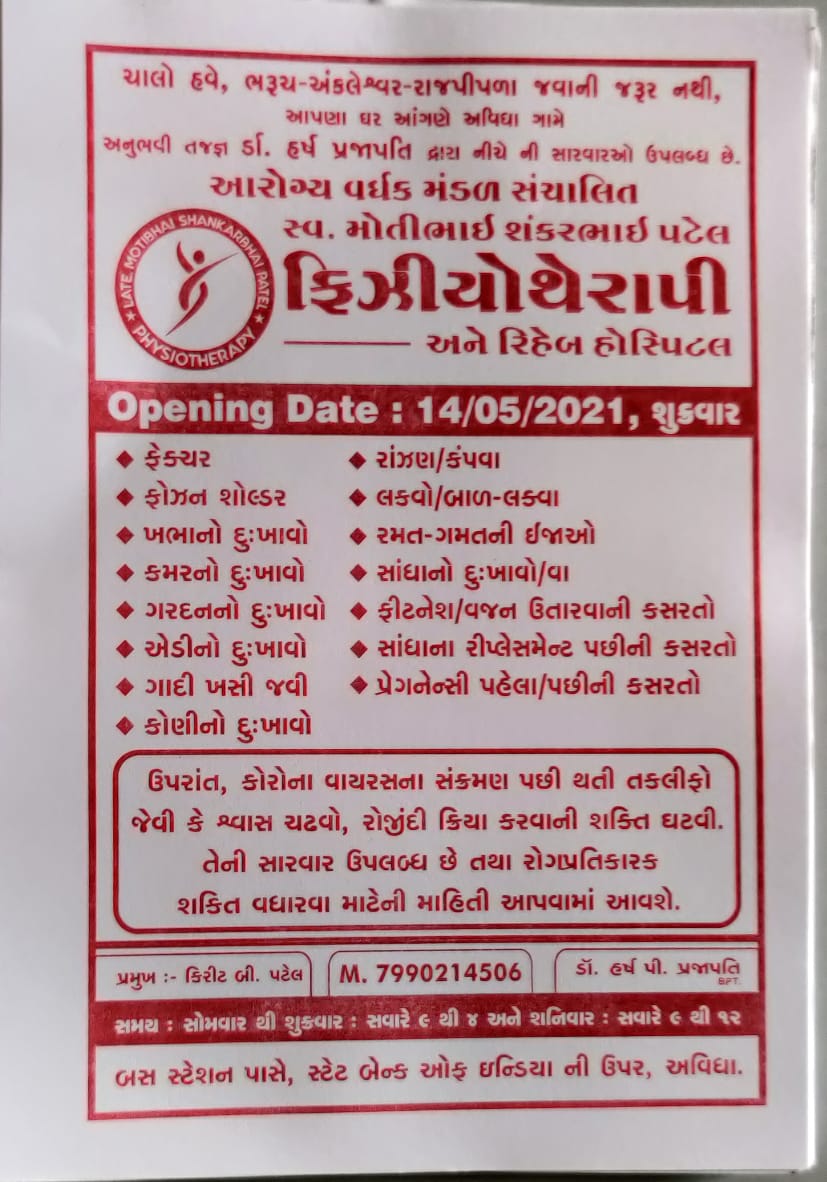 ભરૂચ જિલ્લાના ઝઘડિયા તાલુકાના ગ્રામીણ વિસ્તારોમાં લોકોએ ફેક્ચર તેમજ નાની મોટી ઈજાઓ થવા સમયે જરૂરી સારવાર માટે ભરૂચ, અંકલેશ્વર કે રાજપીપળા સુધી નજર દોડાવવી પડે છે, ત્યારે ઝઘડિયા તાલુકાના અવિધા ગામે કાર્યરત આરોગ્ય વર્ધક મંડળ દ્વારા ફિઝિયોથેરાપી અને રિહેબ હોસ્પિટલનો શુભારંભ અખાત્રીજના દિવસથી અવિધા ખાતે કરવામાં આવ્યો છે. આ હોસ્પિટલમાં ફેક્ચર, ફોઝન સોલ્ડર, ખભા કમર ગરદન એડીનો દુખાવો, ગાદી ખસી જવી કંપવા, લકવો, બાળ લકવા, સાંધાના રિપ્લેસમેન્ટ પછીની કસરતો વિગેરે તથા કોરોના વાયરસના સંક્રમણ પછી થતી તકલીફો શ્વાસ ચઢવો, રોજિંદી ક્રિયા કરવાની શક્તિ ઘટવી, વિગેરેને લગતા ઉપચાર હવે આરોગ્ય વર્ધક મંડળ સંચાલિત સ્વ. મોતીભાઈ શંકરભાઈ પટેલ ફિઝિયોથેરાપી અને રિહેબ હોસ્પિટલ ખાતે કરવામાં આવશે.આ હોસ્પિટલમાં અનુભવી તબીબો દ્વારા સારવાર આપવામાં આવશે.